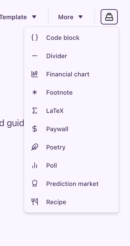 You can add a custom placed paywall, footnote, chart, formula or recipe from the more tab. The best feature is placing your paywall artfully to encourage upgrades to paid.