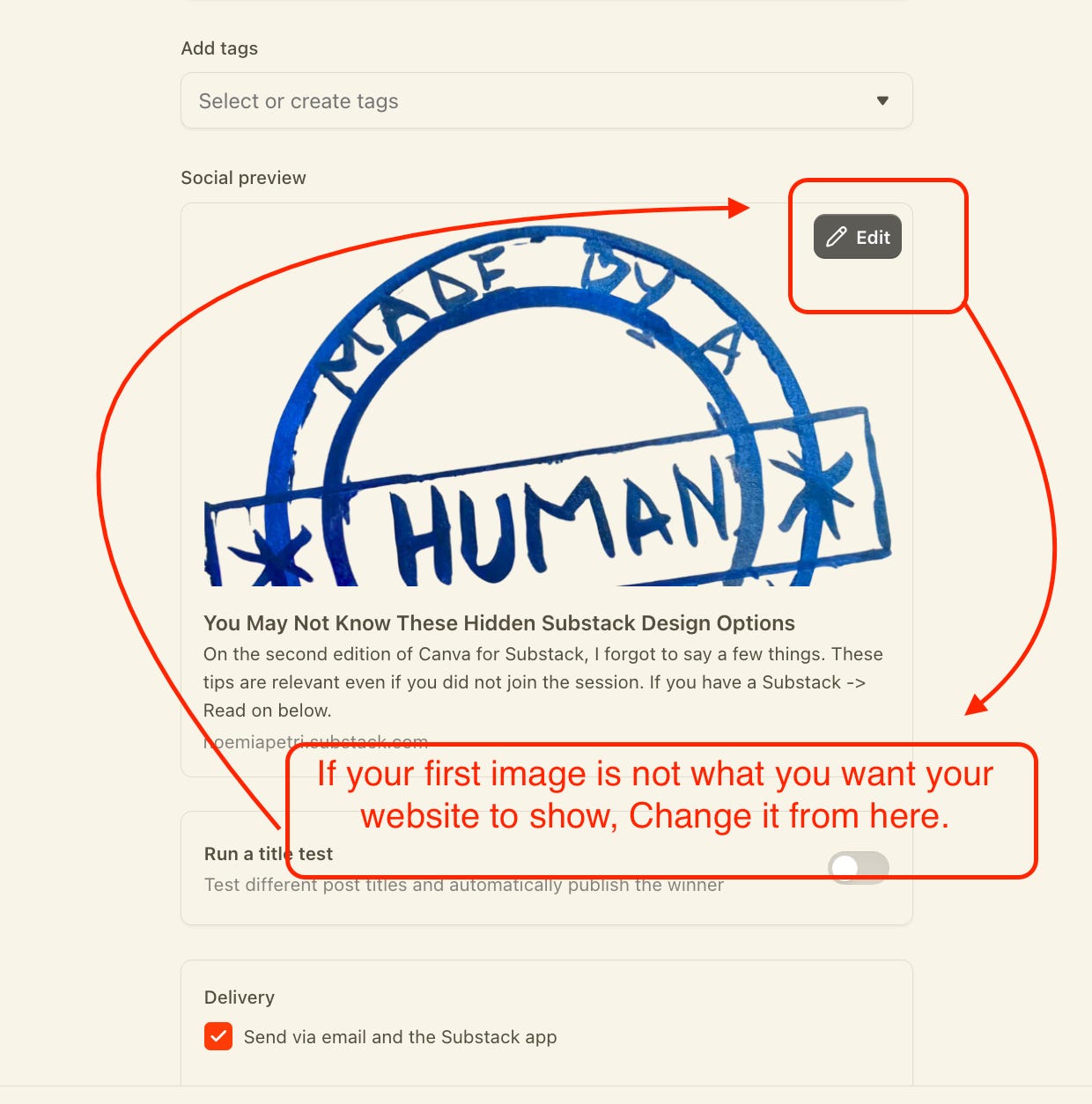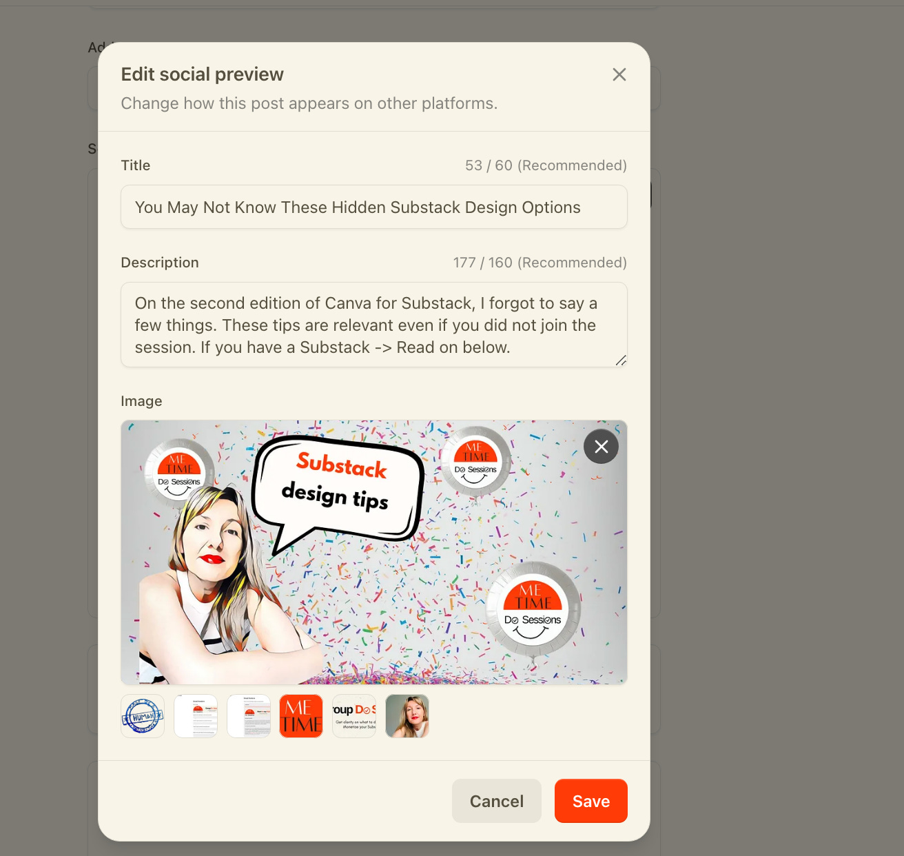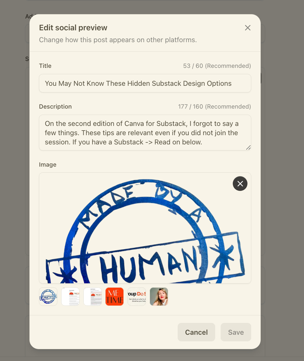 If you do not like the picture Substack has selected in the post. Or it doesn’t look good… before you publish your post you can edit the Social Preview. (You can also do it afterwards and no new emails will be sent no worries!). See the screen prints for the steps to edit the default article cover. Plus social preview text.