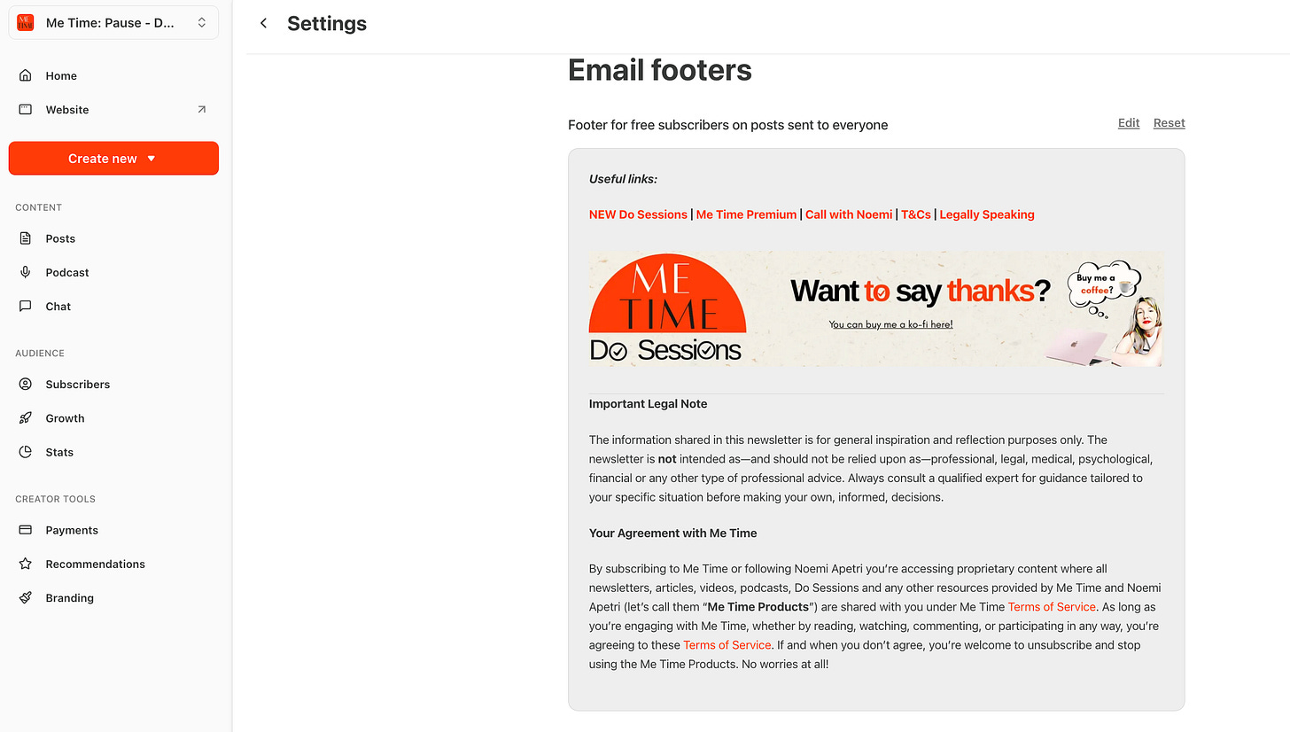 Hidden Feature 3: There are also Email footers. Different ones for different types of subscribers. Here you can link to your T&Cs, put your Ko-fi link on free posts, and you should put your legal disclaimer here too (get it free from Legally Speaking when you subscribe). BUT keep it short. I did not manage… This also goes out on every email even if you do not see it when you draft. So if you add a banner and footer remember they are there!